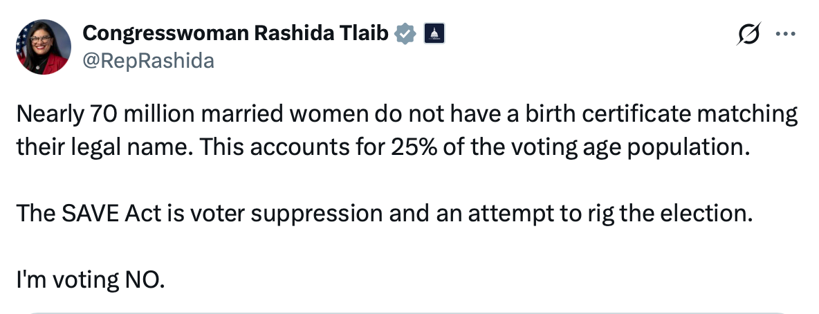 Another tired talking point is “no one listens to or believes women”. Almost 5 years ago I challenged that chapter of victim/oppressor ideology in “Bad Ole Men”. But the SAVE America Act has saved us. With its passage in the House, the Progressive Democrats have launched new material. Are you ready for it women? You’re not just perpetual victims, you’re also stupid and incompetent.